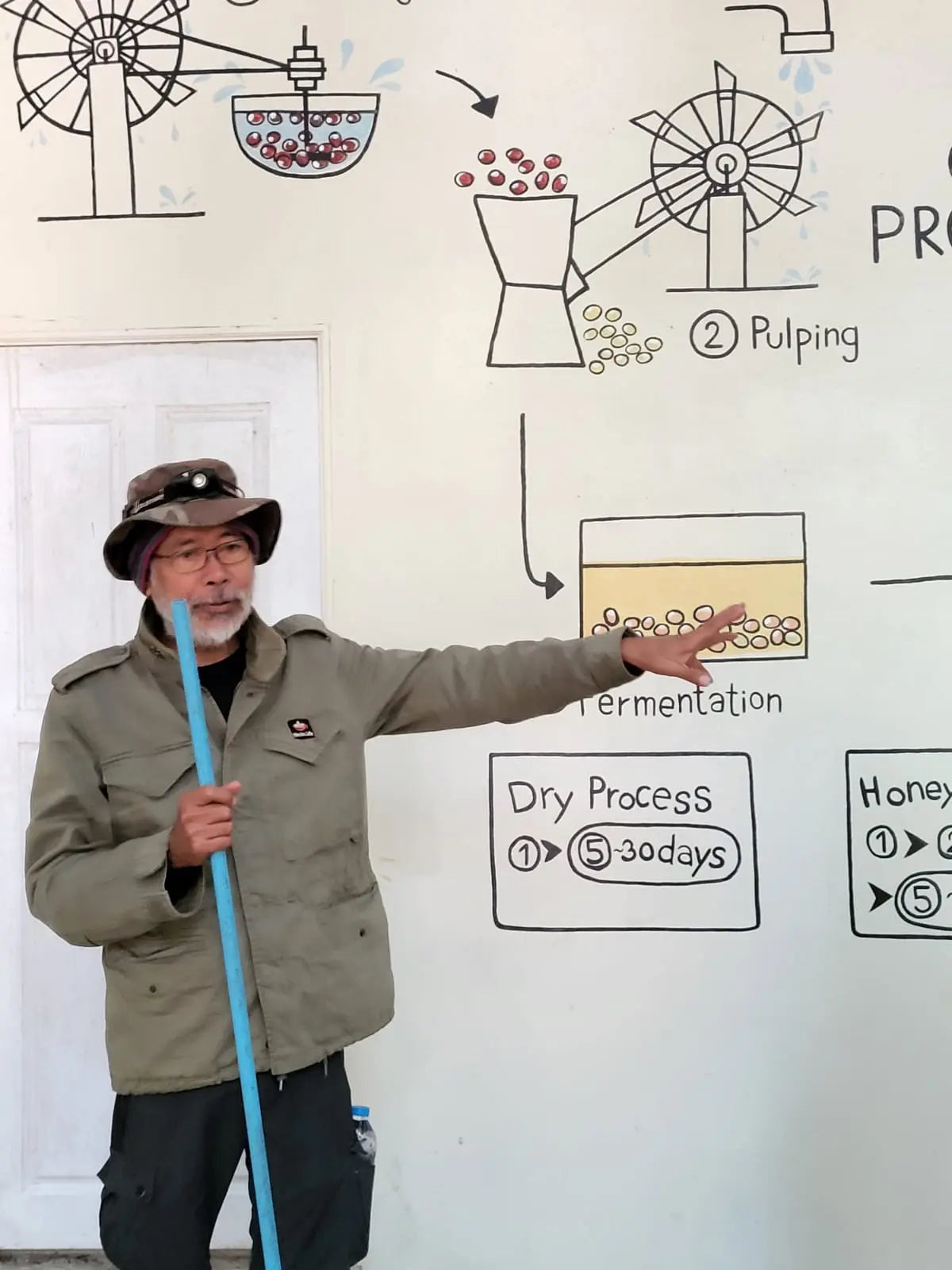 Le café Nine One est produit par l’un des pionniers du café 100 % écologique et de jungle en Thaïlande. Ici, aucune électricité : l’intégralité du process — dépulpage, déparchage, lavage… — est alimentée exclusivement par la force de l’eau, grâce à un moulin hydraulique construit par le producteur lui-même.